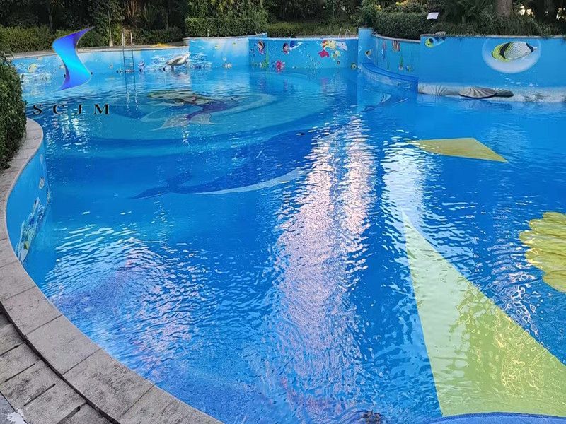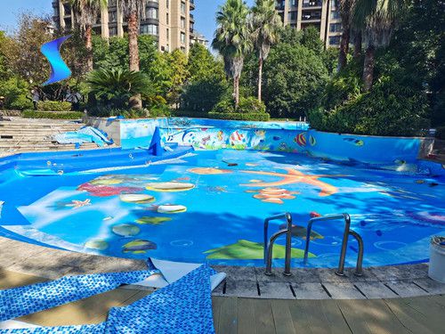 浙江省室外小區游泳池改造防水膠膜定制圖案案例